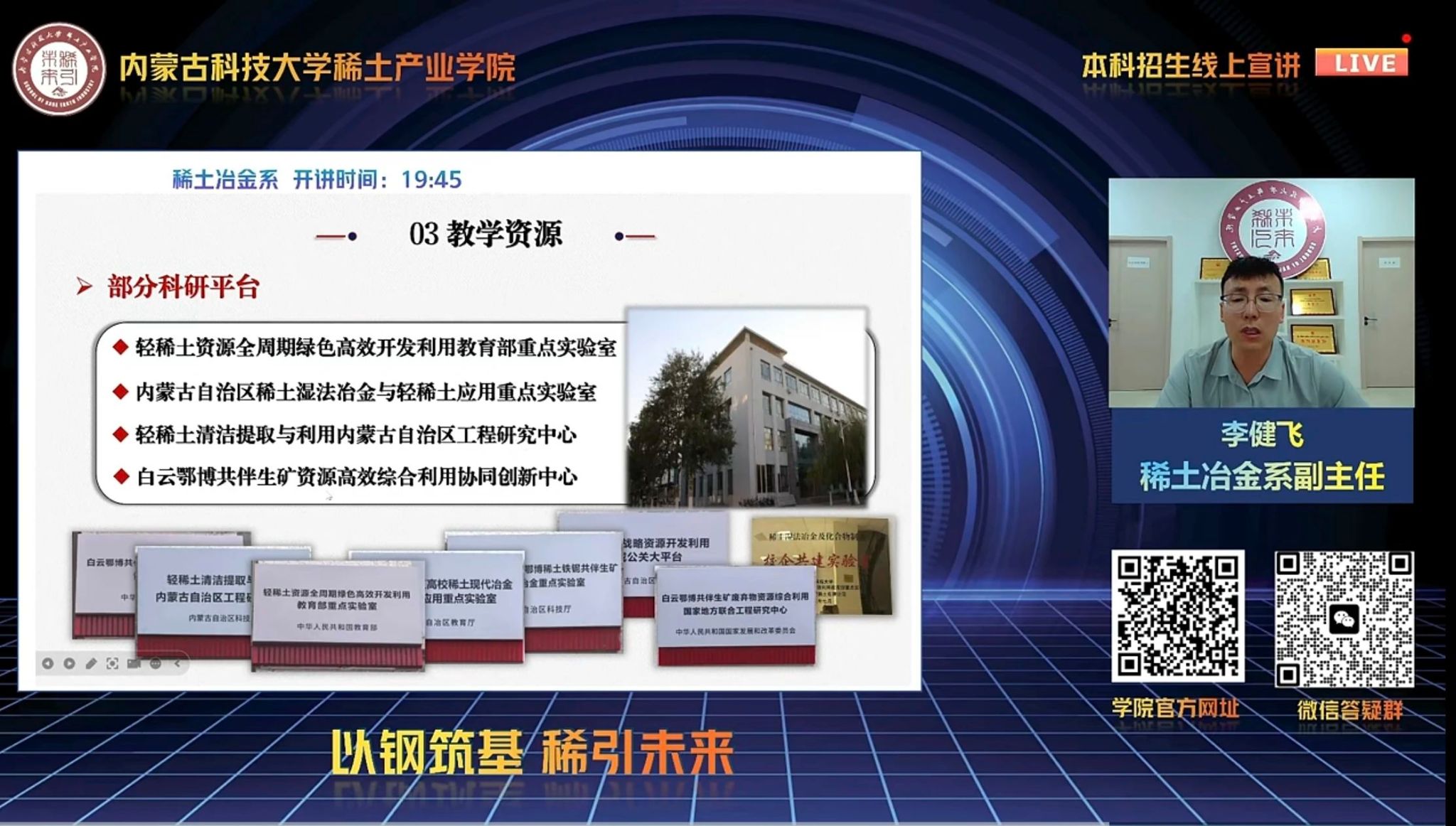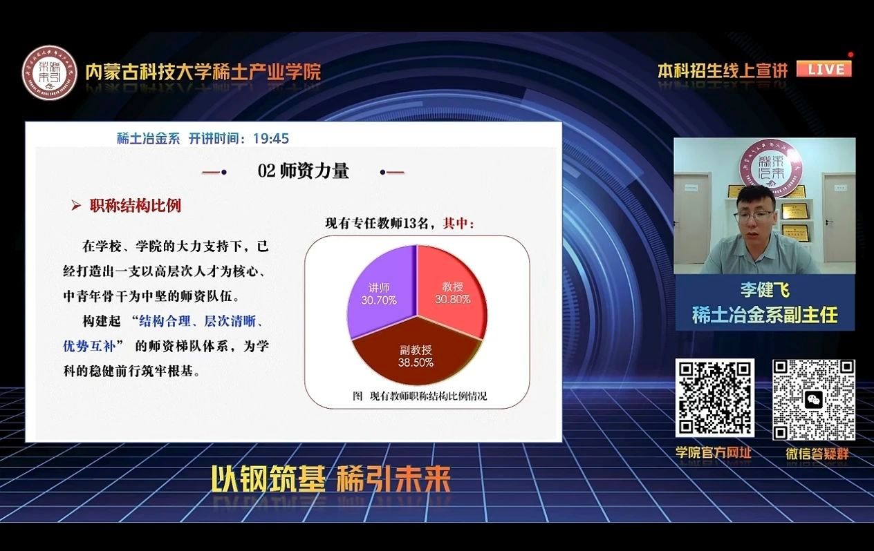直播课堂上,老师以详实的数据与生动的案例,充分展现了学院的雄厚师资储备。既有国家杰青领衔的稀土磁性材料创新团队,也有省级教学名师主导的课程开发小组,全方位展示了“教学+科研”双轨并行的师资优势。同时,围绕稀土资源高效利用、纳米复合材料性能优化等专业问题,老师们结合产学研合作经验,分享了从理论教学到实践应用的完整培养体系,让观众深切感受到学科发展的强劲动力。