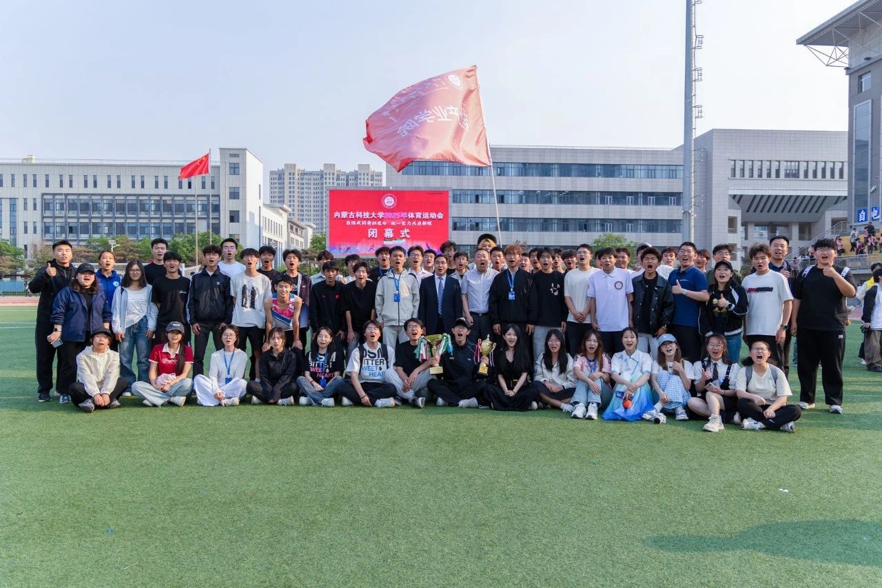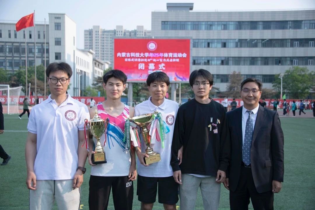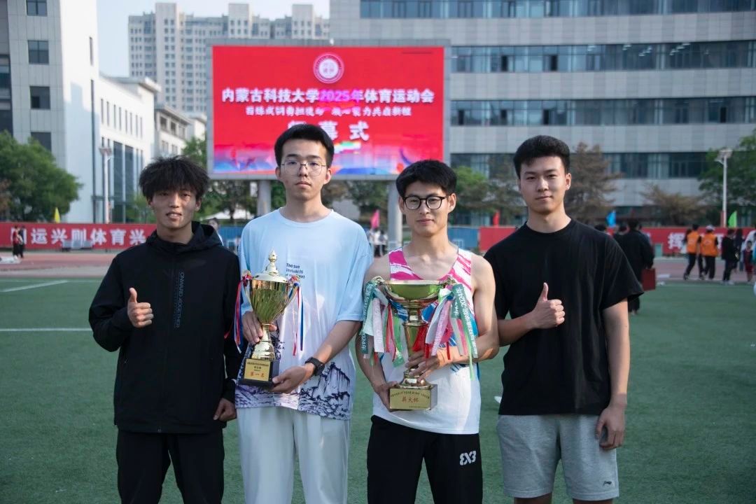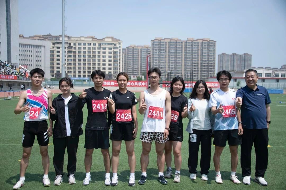 在阳光洒满的运动场上,一场激情澎湃的较量完美落幕。画面上方,我院运动员们意气风发,与老师并肩而立,笑容灿烂。号码布在胸前闪耀,那是他们拼搏的勋章,背后是高楼与热烈的观众,见证着荣耀时刻。