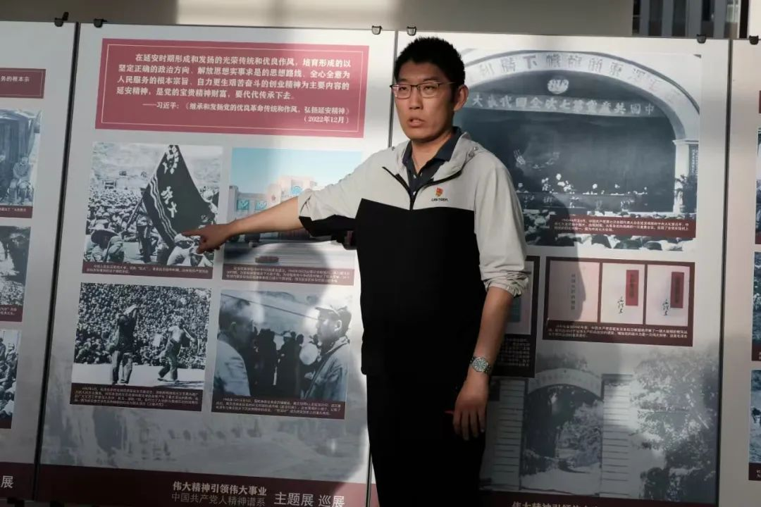 韩聪一同志围绕“伟大精神引领伟大事业——中国共产党人精神谱系”主题展,展开了丰富且深刻的党史内容讲解。院党委副书记冯佃臣同志作为嘉宾与同学们一起全程专注聆听,使现场学习氛围更加浓厚热烈。